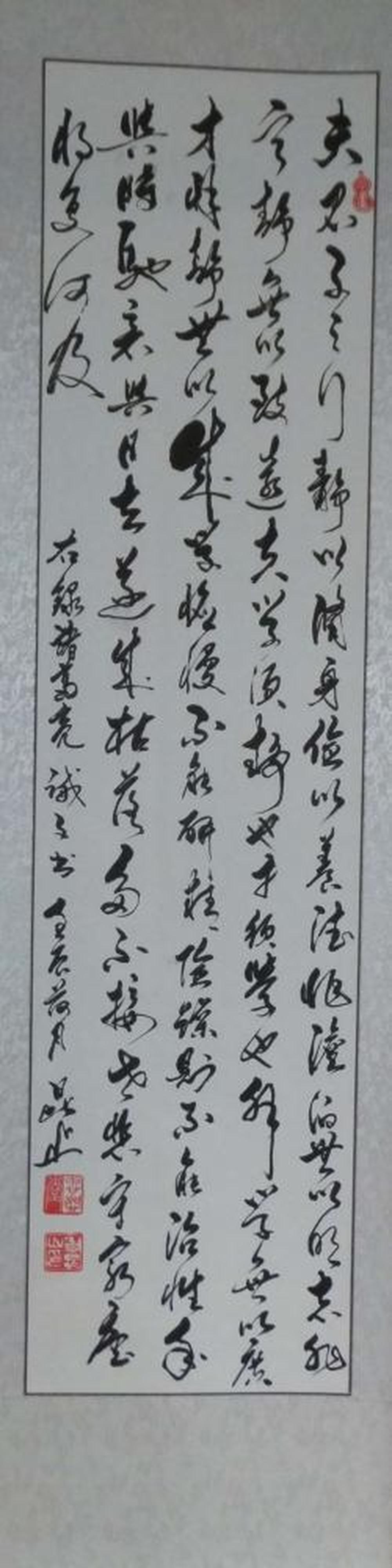 “淡泊明志”,“宁静致远”,是国人耳熟能详的名言,但这两句名言的出处却鲜为人知。为弘扬优秀传统文化,作者将诸葛亮的《诫子书》全文用小草书写,与大家共享。作品一气呵成,清秀流畅,令人耳目一新。